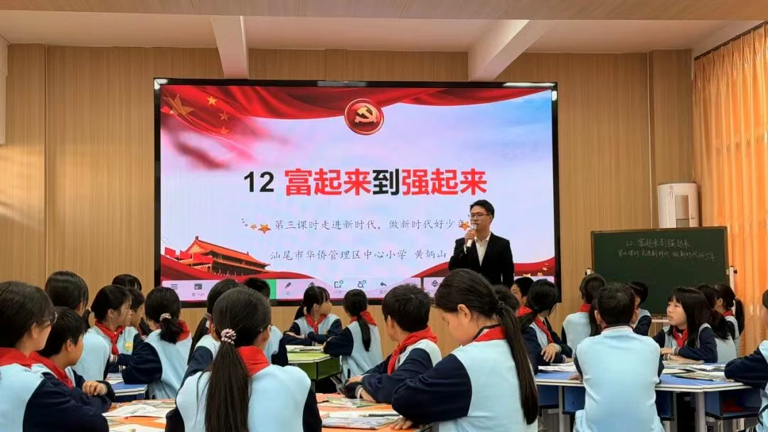 汕尾市华侨管理区中心小学党员教师、汕尾市小学道法学科骨干黄炳山老师,主动发挥党员先锋模范作用,受邀远赴郁南参与研讨交流,以《富起来到强起来——走进新时代,做新时代好少年》为题,呈现了一堂立意高远、形式新颖的精品思政课。