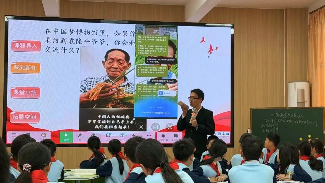 课堂设计独具匠心,以“时光机”为核心线索,串联“2035年的中国”“中国梦博物馆”“梦想工坊”“返航2025”四大教学环节,通过视频展播直观呈现新时代中国在各领域取得的辉煌成就。黄炳山老师充分发挥党员教师的创新精神与育人智慧,巧妙运用ai技术搭建互动桥梁,组织学生与“袁隆平爷爷”隔空对话,同时设置小组知识竞赛巩固学习成果,让原本抽象的思政知识变得生动鲜活。整堂课既饱含深厚的家国情怀,又充满趣味互动,引导学生在沉浸式体验中树立新时代少年的责任担当,厚植爱国爱党情怀,充分彰显了道德与法治课堂的育人价值,也为两地思政课教学交流搭建了坚实桥梁。