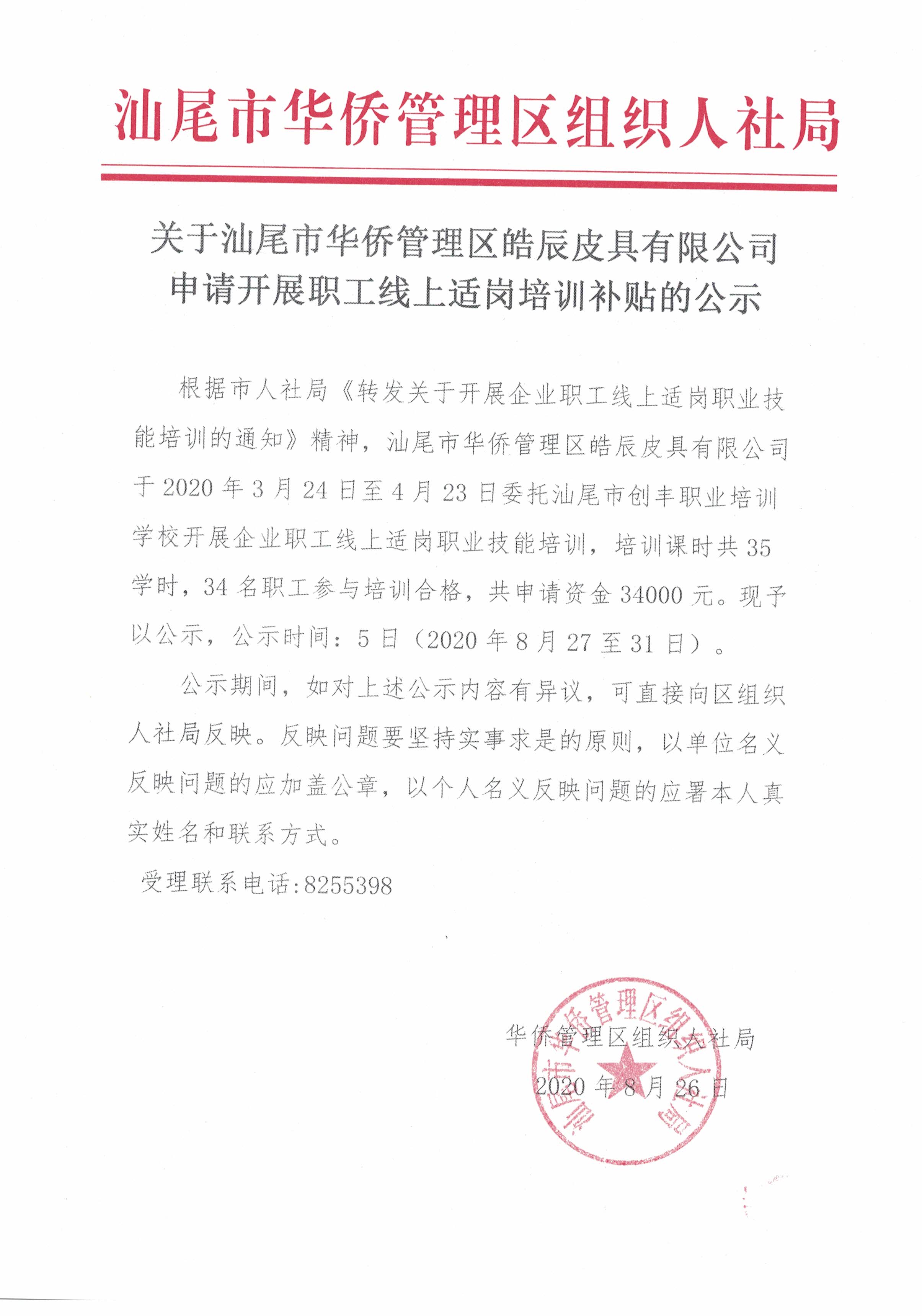 关于汕尾市华侨管理区皓辰皮具有限公司申请开展职工线上适岗培训补贴的公示-维多利亚网址
