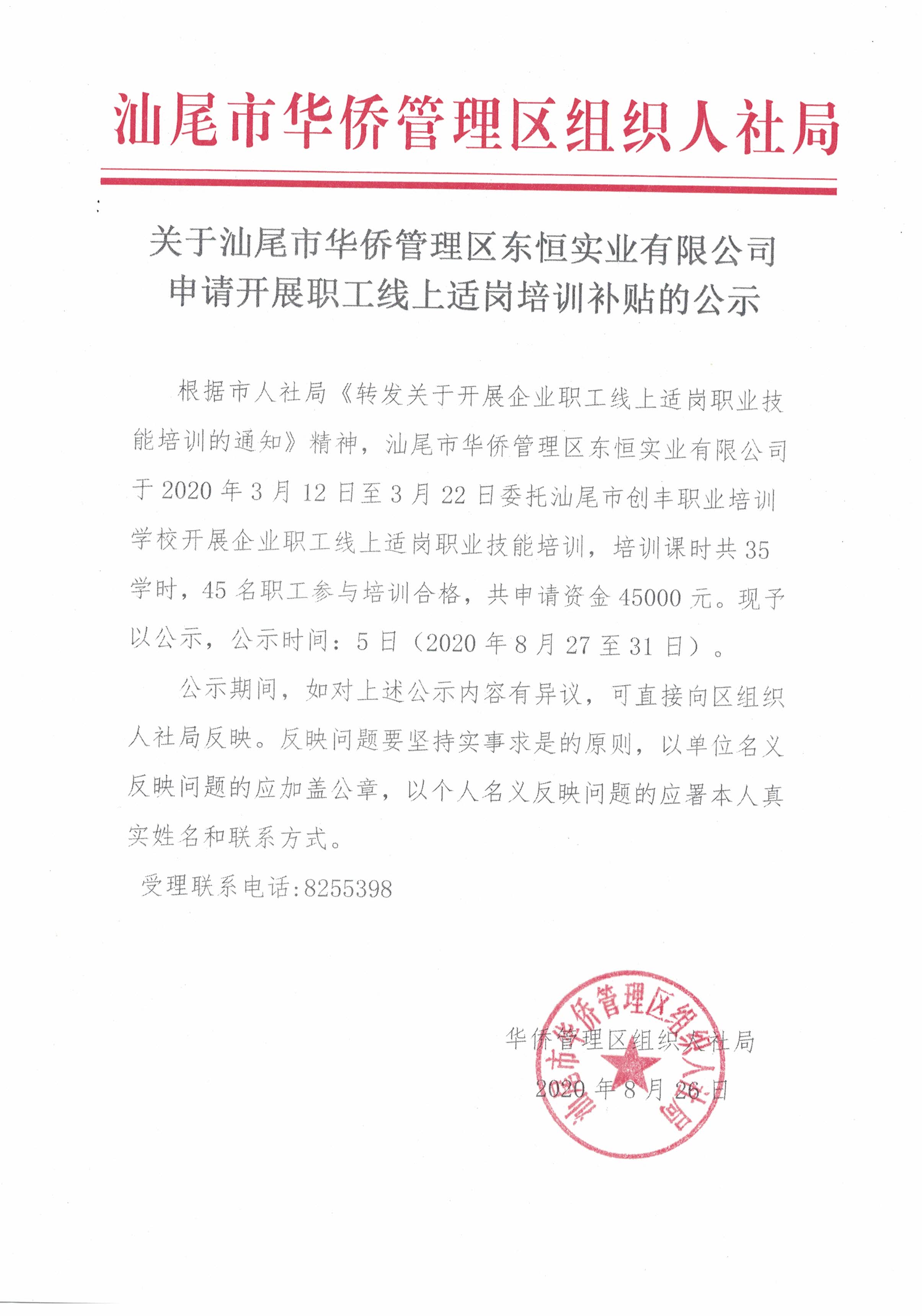 关于汕尾市华侨管理区东恒实业有限公司申请开展职工线上适岗培训补贴的公示