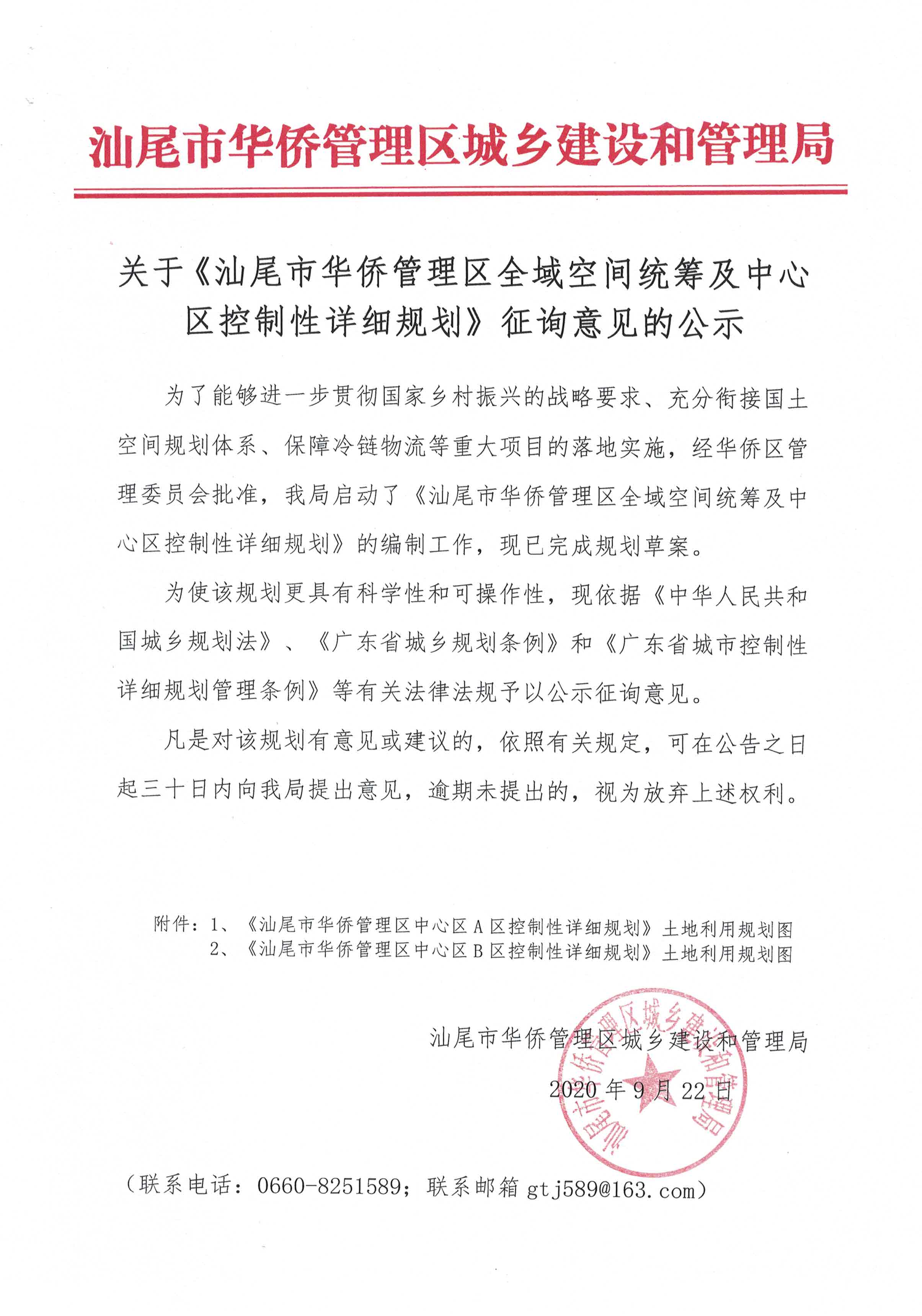关于《汕尾市华侨管理区全域空间统筹及中心区控制性详细规划》征询意见的公示