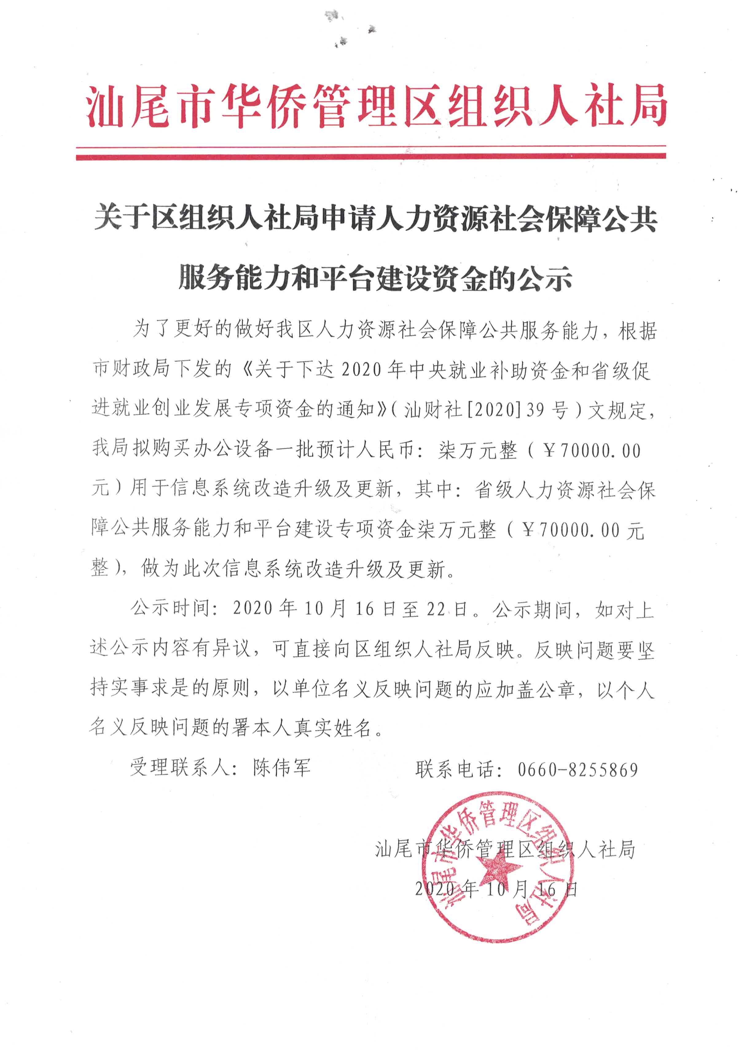 关于区组织人社局申请人力资源社会保障公共服务能力和平台建设资金的公示
