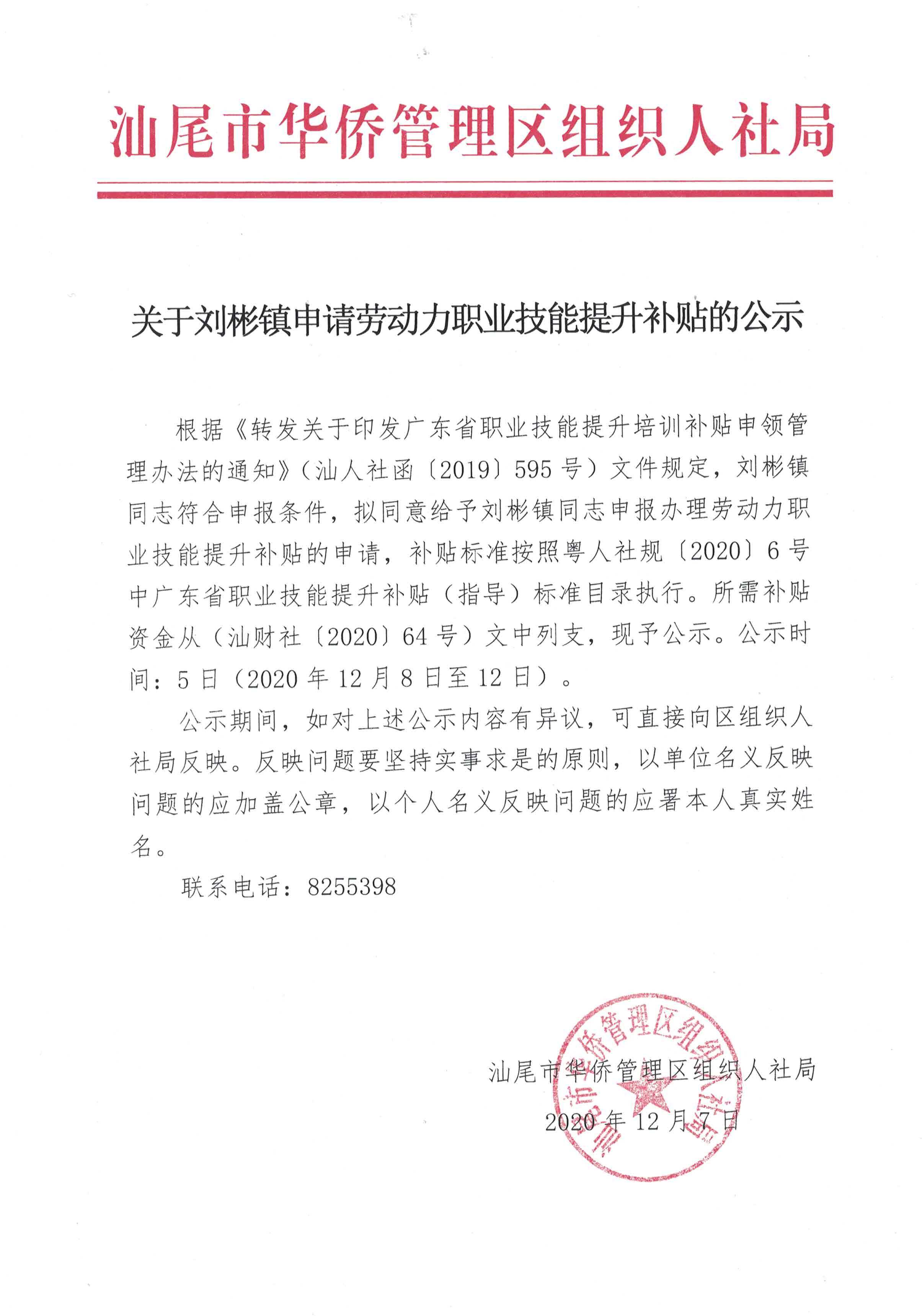 关于刘彬镇申请劳动力职业技能提升补贴的公示