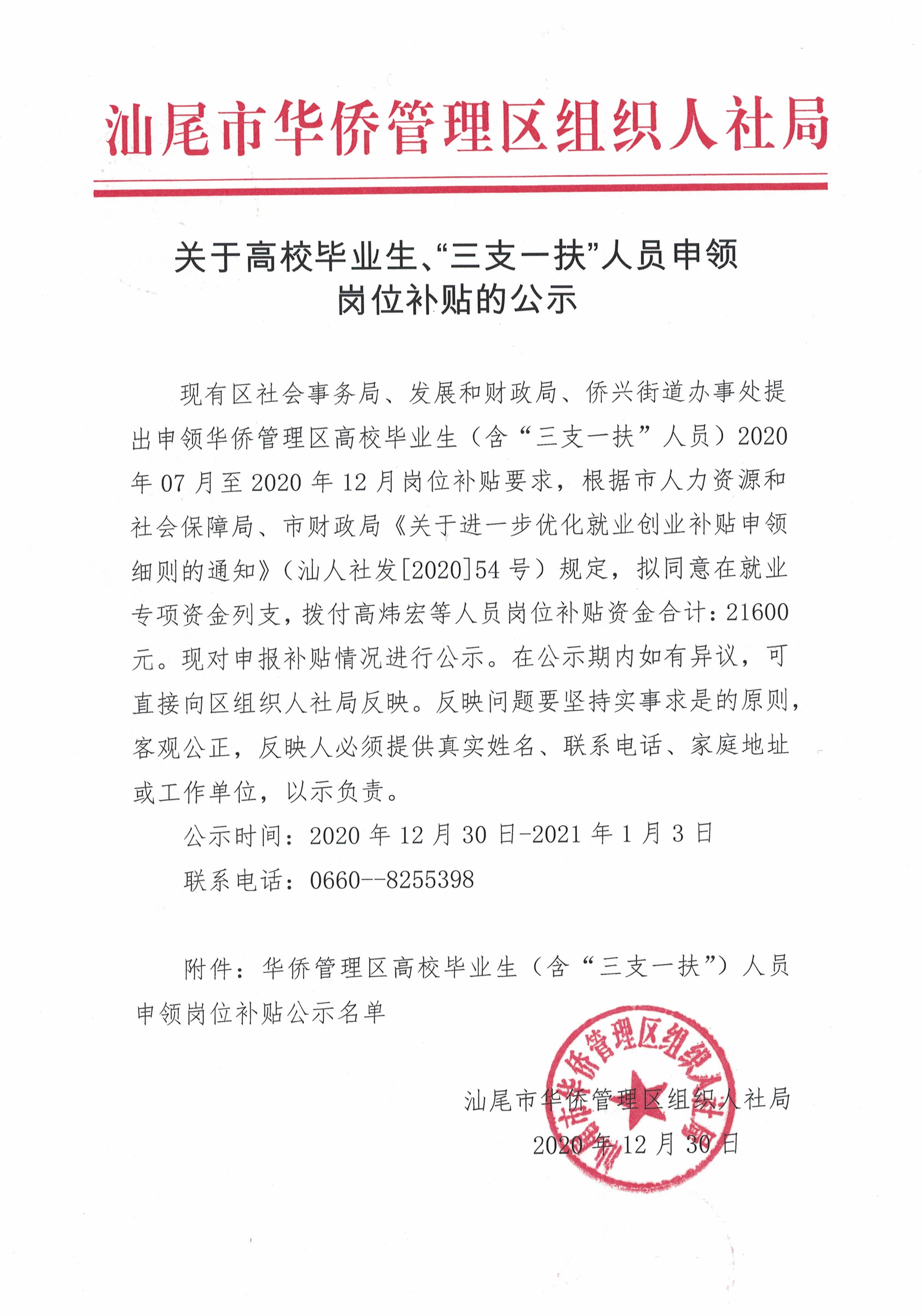 关于高校毕业生、“三支一扶”人员申领岗位补贴的公示